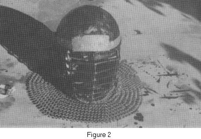 The aventail or camail is the mail piece that fits below the helm to protect the throat and neck. Measure the outside diameter of the helm (fig 1. Identify whether you want to attach the mail by strap or by drilling individual holes for each ring. The helm at fig 2 is attached by rings. Follow the directions for a Bishop's Mantle. Aventail/Camail Figures