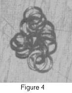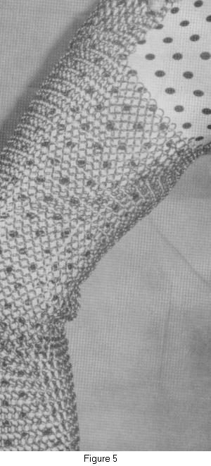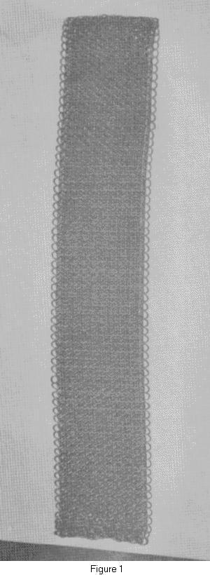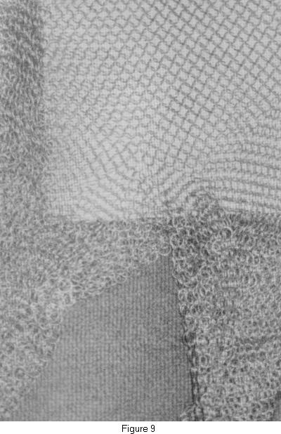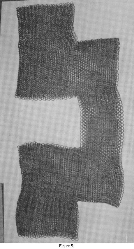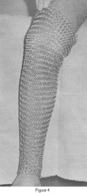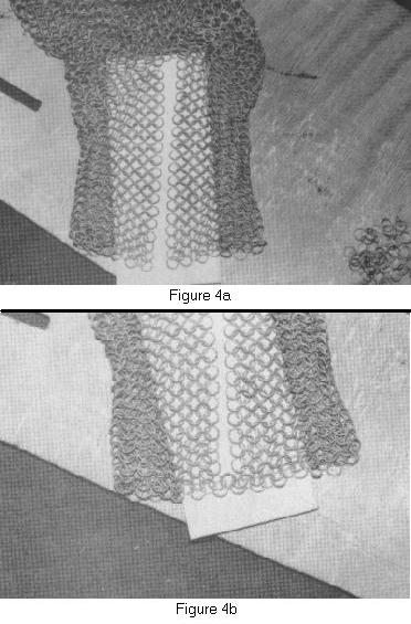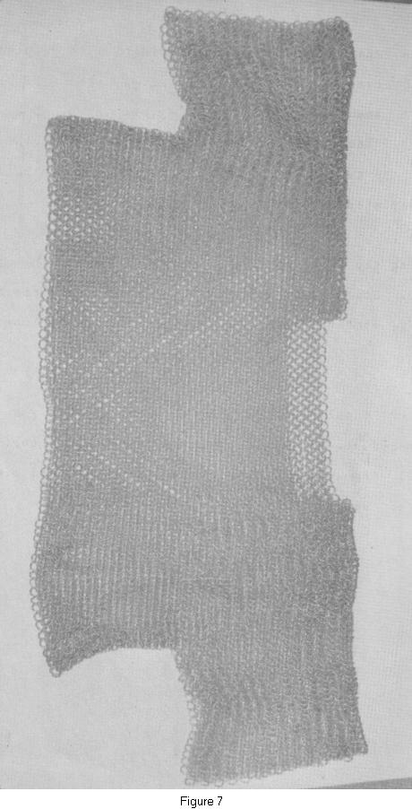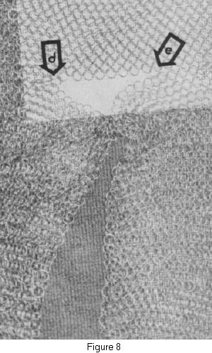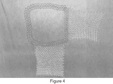 Take a piece of cloth long enough to comfortably fit around you in your most cumbersome garb, i.e. padded gamberson and sweat shirt if you fight in Northern winters. Close it into one piece, fig 1, in the same manner as you knitted the cloth. Knit two sleeves, fig 2. Do this by putting on the chest piece and measuring how much room you need for sleeves. A tape measure will work well, or string tied to the shirt at approximate shoulders. When you know how wide it must be measure from your collar bone to as far as you wish the sleeve to go on your arm, i.e. elbow, bicep, etc. You now can make the sleeves; by knitting cloth into the necessary size. (fig 3). NOTE: Mail spreads when you breath, therefore, you are knitting all your mail sideways. To attach the sleeves lay the chest piece on a large flat surface, a hanger body works very well. (fig 4) Make certain that all your connections are equal, i.e. if you have 11 rows on one side, have 11 on the other. Once the sleeves are attached turn them over and join them. (figs 4a, 4b, 5) The last ring will probably only have 3 to fit in due to the mathematics of the rings. Close in the front to fit. (fig 6) Close the back of the shirt. Knit a piece large enough to fit comfortably across your back and neck. (fig 7) Knit another body piece and connect it to the shirt. Continue to your wishes. NOTE for movement of shirt longer than thigh length a slit is usually desired. See Hauberk text. Slits are mode by removing rings to desired length. Hauberk Construction Figures
