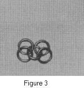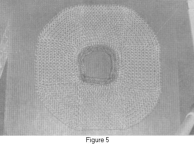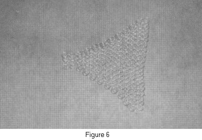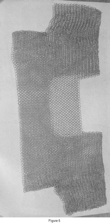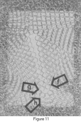 The expansion panel is used primarily for expanding specific areas of a piece of mail, i.e. a coif or fauld hip. To expand a specific area lay out the pieces as shown in fig 1. Each of the sides should be equal length. Connect the two single rings with one ring at arrow fig 2. That completes the first row. Ring the first two rings of row 2 (fig 3). Complete the row. Start again with row 3 (fig 4). Complete the row (fig 5). Continue to do this until all rows are completed (fig 6). There should be a discernable pattern when you complete this procedure. It will appear as a triangle inserted into the mail. As long as the work is balanced on all sides it should not detract from the appearance. Expansion Panel Figures