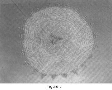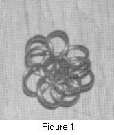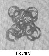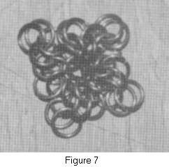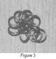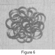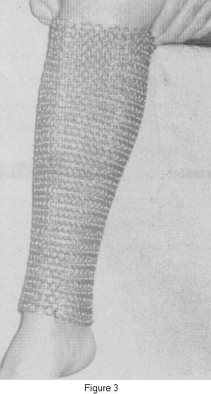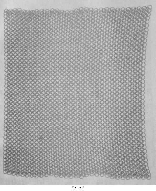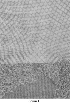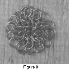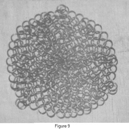 The bishops mantle is a circular collar of mail that usually falls over the shoulders, with or without dags attached; dags are small triangles that are applied at the edge of the mantle. To begin, measure your head size and add three inches to allow the opening to fit over your ears and nose. Knit enough ringlets to equal measured length and connect to form rows one through three. (fig 1) Count the rings in the outer row. (fig 2) Divide by 4 (Ed: e.g. fig 2 shows 30 ringlets; 30 divided by 4 is 7.5 ringlets.) Knit four pieces of mail five ringlets wide for adults, three for children, as long as the number you got when you divided. (fig 4) (Ed: If the number ends in "1/2", you can add rings to represent 1/2 a ringlet. If the number ends in "1/4" or "3/4", you must make some panels 1/4 a ringlet wider, and some 1/4 a ringlet narrower, so the sum of the four panels still adds up to the total.) Close in the four openings (fig 5) as shown in Explansion Panel. If you wish the mantle to hang over the shoulders in a more conical manner attach another piece of mail to the mantle without an expansion. (fig 6) The mantle is now complete. For dags, count the number of ringlets in the outside row. In the example there are 69. (fig 7) Divide that number equally to determine number of dags. 69 divided by 3 equals 23 dags. (fig 8) If there is no equal number, or if you want larger or smaller dags, add or subtract rows. Bishops Mantle Figures