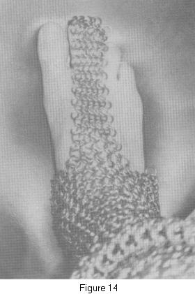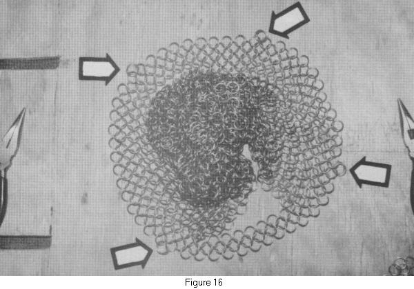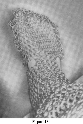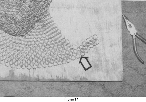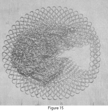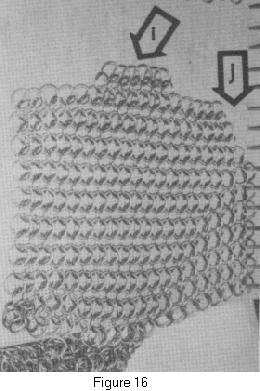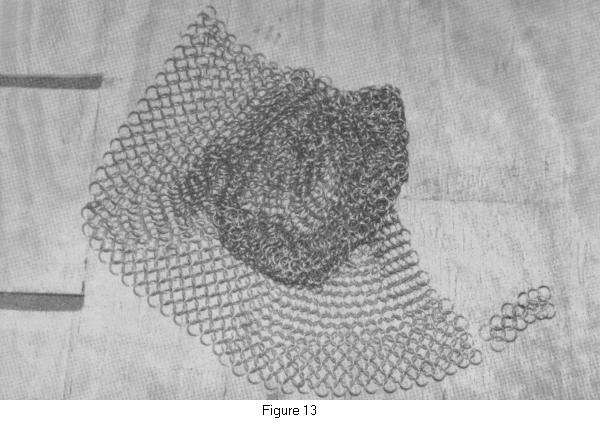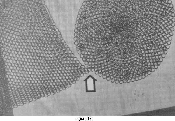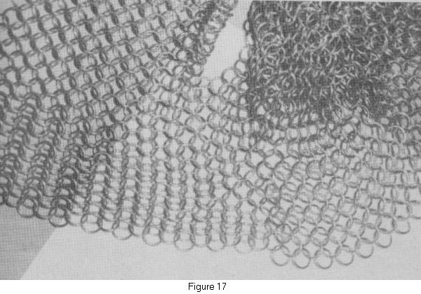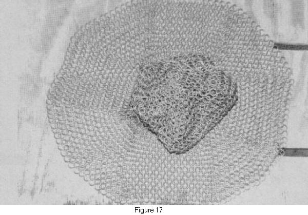 Close ten rings. Place those ten closed rings on one open ring and close it (fig 1). You now have one row completed. Place one ring through two of the adjacent rings of row 1 (fig 2). Place a second ring through the same two rings you placed the first one through (fig 3). Repeat the operation with the next two rings (fig 4). Skip one ring of row one and repeat the operation two more times (fig 5). Lay your coif on the knitting board and connect the remaining rings of row one with single rings (fig 6). You have now completed row two. To begin row three close two rings through two rings of row two at four equally spaced points of the coif (fig 7). Fill in the rest of the row with single rings (fig 8). Repeat this process until you have ten rows completed. Rows eleven and beyond will have three sets of double rings (fig 9). Fill in the remaining rings with single rings. Begin trying on the top of your coif anytime to get a proper fit. It should sit flat on your head and come to just above your eyebrows. When the top is completed proceed. You now need to make the side. To identify how long to knit the panel for the side place the coif on your head and measure how wide you wish the facial opening. Mark the two side rings with tape and count the number of rings remaining (fig 10). That number divided by two will correspond to the number of chains you need to knit. To knit the panel see making chain and cloth. To attach the side to the top lay out the top on a large flat surface, such as a table top, shield, or hanger body. Lay your side panel next to the coif int he manner shown in fig 11. Connect the side to the top in the same manner you connected the chains together (fig 12). To close the coif put the top with side attached on your head and measure how wide at the chin you wish it to be. Fill in that space with ringlets (fig 13 - 15). Once the chin is closed begin to expand the bottom either with four sets of double rings as you did above (fig 16). Continue until the coif is the desired length or use expansion panels. To use expansion panels, which is quicker, but does not give the coif a perfect roundness; the panel causes the bottom to be octagonal, divide the coif into four and attach four pieces of cloth as long as you with the coif to be. Expand the four openings as shown in Expansion Panel. This process is identical to the aventail and bishops mantle. You have now completed your coif (fig 17). Coif Figures