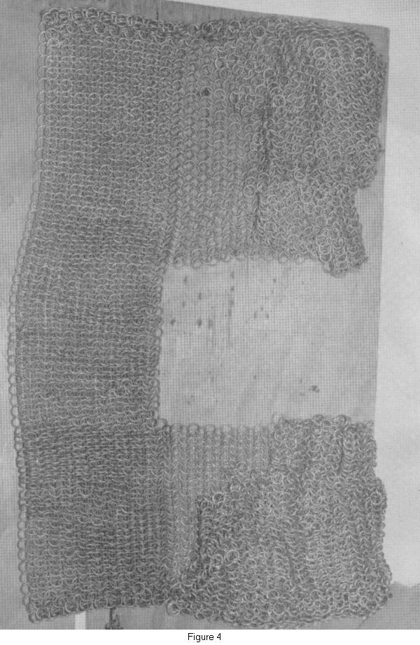 The mail used by the Europeans, which includes the British Isles, Europe, and Scandinavia, are all similar in pattern and principle design. The COIF was the close fitting mail hood used between the 11th to the 14th century to ward off blows or injury to the head either under a helm, or used by itself. The coif would be either attached to the hauberk at the neck with a flap that could be drawn across the face and buckled or strapped to the side of the coif, or worn free standing, with a mantle extending to the sternum for neck and throat protection. In either case the coif was made to cushion a blow to the head or helm, and keep the wearer from being cut by glancing or light blows. The AVENTAIL also called a CAMAIL had a similar function as the coif. It was the mailled portion that hung from the base of the helm to protect the trachea and neck. They were attached to the helm by a strap or a series of rivets at the base of the helm that allowed the camail or aventail to hang freely. The aventail was widely used until the 16th century when it was gradually replace by the gorget; the hard leather or metal collar that fit under the head and over the collarbones to protect the neck and throat. The last major piece of upper shoulder armour was the BISHOPS' MANTLE. The bishops' mantle was named for the shoulder covering of the clergy at that time, and protected that portion of thebody, the shoulders and usually as far down the front and back as the sternum and mid spine. The B/M began at the neck with a leather strap that buckled it in place and then extended in a circular pattern out to the shoulders. The B/M when attached to the helm became an aventail. To cover the chest and lower body parts the warriors wore a HAUBERK or BYRNIE. This was a shirt of mail, either short sleeved, ending at the elbows, during the first part of its use, or long sleeved, with flaired cuffs often extending over the hand, during the latter part of the middle ages. Slits were applied to the front and back of the shirt to allow mobility and in some instances the crotch area was left open to allow horse riding. In addition a flap could be drawn from the back of the shirt, through the crotch, to the front of the shirt to act as a protection for the genitals. This was referred to as a BREKE OF MAIL.2 Until the 14th century the hauberk was the primary armour of the warrior. After the 15th century, however, the plate became the primary form of armour, and the hauberk was used as an undercoat, designed to fill in the gaps left open at the elbows and arm pits. When a warrior wore a metal breast plate he would often use a mail SKIRT or FAULD to protect the lower body parts, usually extending to above the knees. In the beginning the term fauld was used to describe mail exclusively, but as plate became more widely used the fauld became part of the armour of the time, and was formed out of metal. The mail fauld was useful in slowing or stopping blows to the inside leg and crotch, from either the front or the back. Other pieces of mail used during this time were the BREECHES, or PANTS of mail held up by suspenders over the shoulders, and usually with feet attached. The feet were mail coverings over the top of the foot and attached to a leather piece of sole for comfort and mobility. Although GLOVES are often represented as being widely used in the middle ages the hands were more likely to be covered with MITTENS. The mittens were attached to the sleeve of the hauberk and held onto the hands by leather strapes that ran across the palms. Mittens could also be used as stand alone armour, at which time they were strapped to the wrist, similar to our present day wrist watch strap and then lashed across the palm. Either way they were a solid piece of mail the covered the four fingers, with independent thumb covering. Finally, the last major part of mail was the SLEEVE. The sleeve was strapped to the gamberson and the shoulder, affording upper and lower arm protection, without the added weight of the hauberk. Sleeves were designed for the situation and therefore would or would not have mittens attached. |