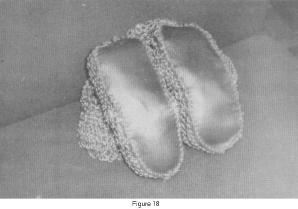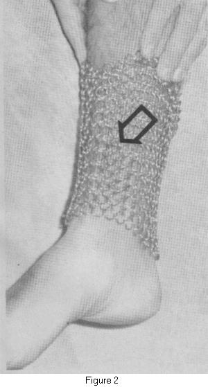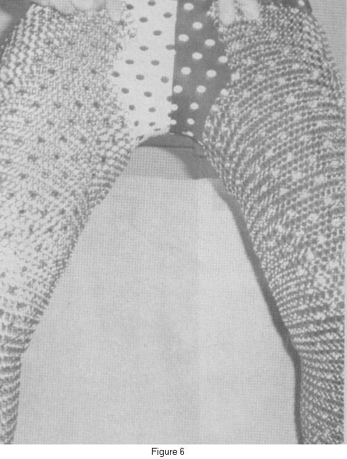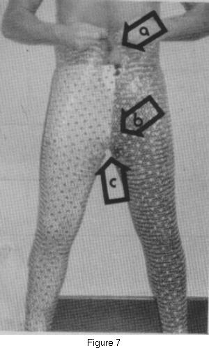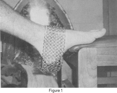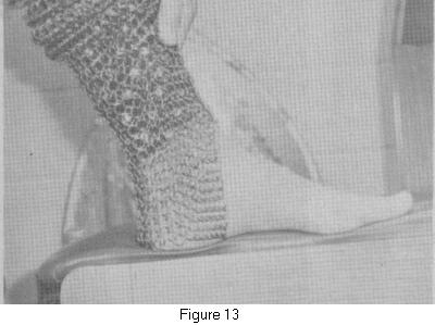 The pants are another item that must be form fitted to the individual. Each set of legs, or in some cases, each leg is of a different size and configuration. Therefore these directions that follow are for a pair of legs that are of average size and length. To start knit a piece of cloth three ringlets wide and as long as necessary to fit over the ankle without being loose. (fig 1) Knit a piece three ringlets wide and two ringlets longer than the first piece. Add an expansion ring at four points to your first piece of cloth and attach to second piece (fig 2) (the arrow shows an expansion ring attached to the cloth). Continue doing this with two sets of siz wide cloth, four expansion rings each. (figs 3-5) To fit up over the hip knit a piece that covers the hip but leaves the crotch and rear areas open. (fig 5) Repeat figures one through five until you have two legs completed. (fig 6) Connect the two legs toegether with cloth, (fig 7) and leave room at the navel for a tie, (fig 7,a). Close in the crotch area and rear areas with pieces of cloth, (fig 7,b) and prepare to close the under crotch area. (fig 7,c) Alternating sides connect the leg portion of the pants to the body portion. (fig 8,d+e) Continue front and back until you have joined all rings. At this time you will have an opening that extends from the front to back along the bottom of the pants. (figs 9 + 10) Close that opening by starting at arrow F, fig 11, opening that ring, passing it through rings at arrows G + H, and closing the ring. Continue as such until all rings are joined in a four in one pattern. (fig 12) Knit a piece long enough to go from the sides of the foot to the sole of the foot. (fig 13) Next knit a piece to fit across the top of the foot and to extend over the toes. (fig 14) Make two more pieces, (fig 15) to fit from the top of the foot to the sole. Extend the pront of this piece as in fig 16,i and trim the piece for the smaller toes as in fig 16,j. Connect the sides together using a modified expansion panel. (fig 17) Finish the pants by sewing a piece of leather to each foot. (fig 18) The pants may be worn with suspenders, or loosely by tying the front opening together. For best fit use both a tie and suspenders. LEG LENGTH AND WIDTHS OF PIECES: