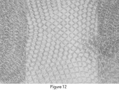 In the European theatre the rings were generally passed through four others to form a tightly woven pattern of wire, often referred to as four in one, or four rings joined by one. This is the mail of the time, and is the primary, if not sole, pattern of the European, Celtic, and Norse warriors. Surviving pieces of mail from the first century AD show this mail to have been rivetted, welded, stamped, or butted. The rivetted mail was used to join the welded, or stamped rings together. Rivetted mail was made by first curling wire on a dowel or rod until a coil was formed. This coil was then cut into many rings by a set of wire cutters or a chisel. The rings were reduced in diameter by pushing them through a conical die, similar to the drawing technique previously discussed. This left the ring with an overlapped area that was flattened with a hammer and then punched with a hand punch or iron rod. The punched rings were then closed by a small rivet, similar to a modern day staple. If the mail item was to be made of all rivetted rings the rings were then joined together by other punched rings to form the four in one pattern, and only then would the non rivetted rings be finished. If the rivetted rings were to be used to join welded rings then the rings to be welded would be cranked on a rod the same approximate diameter as the finished diameter of the rivetted rings. The welded rings would be forged until they could be heat joined and then they would be 'knitted' into the item under constructon. Stamped rings were knitted the same as welded, however they were created by punching out the shape of the ring from sheet metal. The pieces that have come down to us from the past show a center bar inside the stamped ring, to add strength. Even though this process was time consuming and extremely expensive: a suit of mail could cost as much as five war horses, it was the best protection at the time. The closed rings were strong enough to withstand the severe blows of the ancient weapons, without openning up to easily. Butted rings were used at that time as a quick fix to a piece of armour until it could be brought back into the shop or to a field armoury for repair. This was evident for mail was so prized that the pieces that have survived are worn thin enough to be able to be broken by hand pressure, suggesting generations of wear. Mail continued to be used as the primary armour until the 15th century when plate began to replace it. Mail, however, was still used under plate to cover the exposed areas such as the arm pit and elbow joint. |