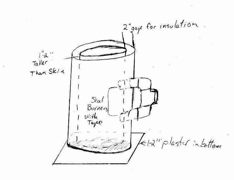 Set the outer skin on the plywood or cardboard base in an upright position and duct tape it into place, making sure to seal the bottom as it will have to be able to hold back the plaster. Once this is finished, cut the sonoform so that it can be placed in the middle of the skin while being 1-2 inches longer than the skin (see diagram). Seal the end of the burners with duct tape and push burners though the precut holes in the skin. mix the plaster to the thickness of heavy cream and pour 1-2 inches thick into the bottom of the skin and, while still wet push the sonoform into the plaster being careful to