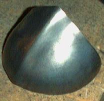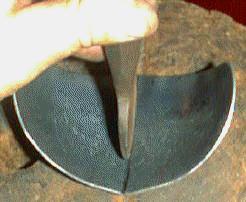 Then, to sharpen up the appearance, I work from the outside, with a light hammer, over a stake [you can substitute the same chisel for the stake, by placing it in a vise, business end up]. Place the metal so that the stake is in the chiseled flute, and tap the outside lightly, along the line of the flute. ![]()