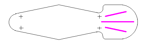 This will be the physically hardest part of the job. Take your time, and get a smooth curve, with an average radius approximately equal to "b" this should naturally bring the undished areas at the ends of the pattern parallel to each other, so that the holes "match up." If you have some bumpiness to take out of the surface of your dishing, do it with the planishing hammer, on the ball-stake. See my article "How to Planish" for more information. If you want to flute the cops, do so with your round chisel, into the slotted dish. Draw a line inside your cop, from point to point, and line it up with the slot. Don't over do it with the chisel, as you dont want to crack your cop in half by trying too hard. Flute your lames with your flat chisel, in the flat channel, along the blue line shown below. Finish up those flutes over a stake as well. Now you are ready to bend your lames into curves that fit into the cops, with flat ends that are parallel, like the cops. Before you curve them, mark them on the outside as the purple line in this diagram. The last inch or so on each end will remain flat.