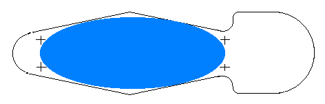 Whatever shape you chose for your fan, you should put at least one flute down the middle of it to strengthen it. Draw lines on your piece, like the purple ones above, and drive the metal, with your flat chisel, into the channel on your forming block. Start from the center, and reflatten the metal to either side of each ridge as you complete it. On the fans, it doesn't really matter, [except for style] whether you push the metal out or in [you could alternate, in fact]. For the best results, you will need to sharpen up your flutes over a stake. See Scott Swindell's article on fluting, or mine [once I get it written]. When that is done, you are ready to begin dishing. Start at the edges, and work your way in. Dish the approximately oval area bounded by the holes, shown in blue below, and dish deeper as you approach the center of the cop.