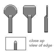 ![]() I use blunted 3" masonry chisels for ridging [AKA fluting]. Inside dished pieces I use the round one, made by grinding a regular chisel down to the shape pictured, and making a blunt edge on it. The round chisel is also for any curved ridge [e.g. around the edge of a shield boss]. The flat one is for straight lines, in flat or curved pieces, and reverse ridges on the outside of dished pieces. So far, these are the only two chisels I've needed, but other sizes might be handy for some projects.