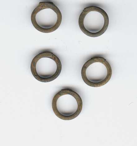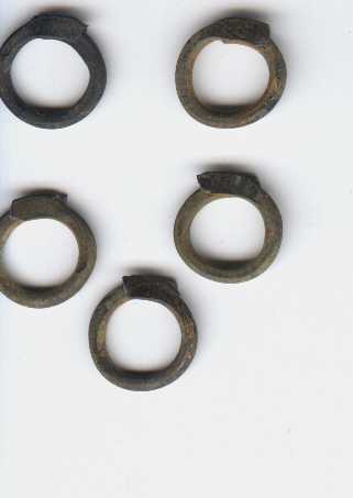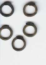 these are the rings I use for most of maille, my hauberk, coif, etc., It is a compromise in cost, toughness, and speed of assembly. The steel is, however, pretty hard, and requires annealing. This is accomplished (for ferrous metals) by heating to a glowing red, then allowing to slowly cool. I did this by stringing the rings on a piece of wire, and placing in a fire of charcoal (notably, my grill, after a weenie roast) I came back later (the next day), and retrieved them . They looked like this: