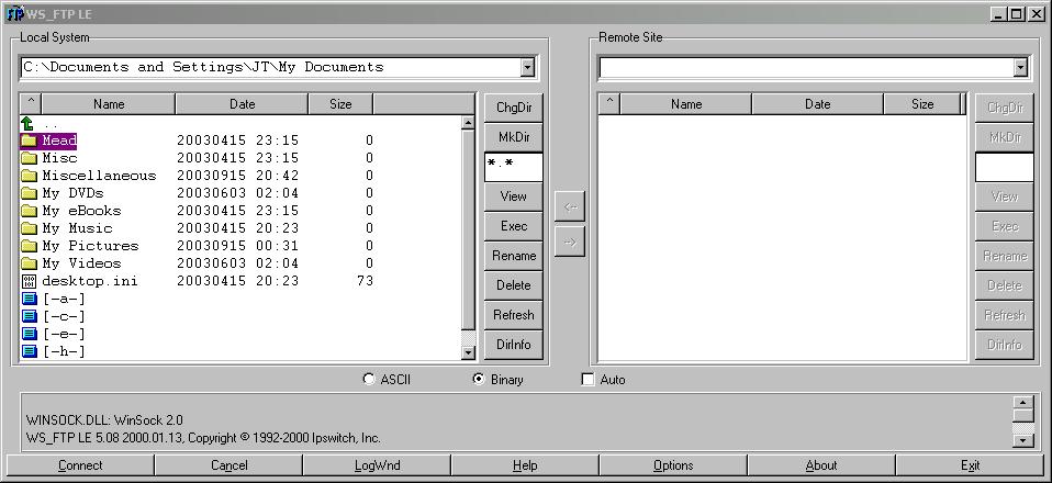 Just below the two file-browser window-panes of the main screen, you should see a bunch of IP addresses (numbers) fly by. Wait until it shows a number, and next to the number says Directory Send OK. You've just connected to the Archive's member web space! In the right file-browser window-pane, there should be a green arrow at a right-angle pointing up. Below that should be two folders listed: