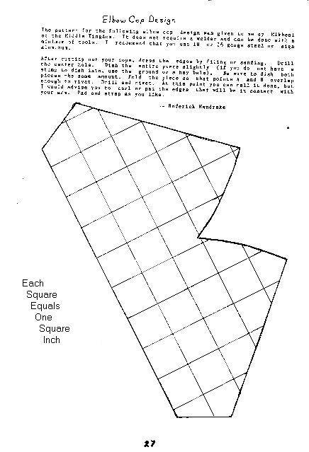 Patterns (Click on thumbnail for full-size image) The pattern for this elbow cop design was given to me by illegible of the Middle Kingdom. It does not require a welder and can be done with a minimum of tools. I recommend that you use 16 or 18 gauge steel or sign aluminum. After cutting out your cops, dress the edges by filing or sanding. Drill the center hole. Dish the entire piece slightly (if you do not have a stump to dish into, use the ground or a hay bale). Be sure to dish both pieces the same amount. Fold the piece so that points A and B overlap enough to rivet. Drill and rivet. At this point you can call it done, but I would advise you to curl or pad the edges that will be in contact with your arm. Pad and strap as you like. -- Roderick Mandrake |
