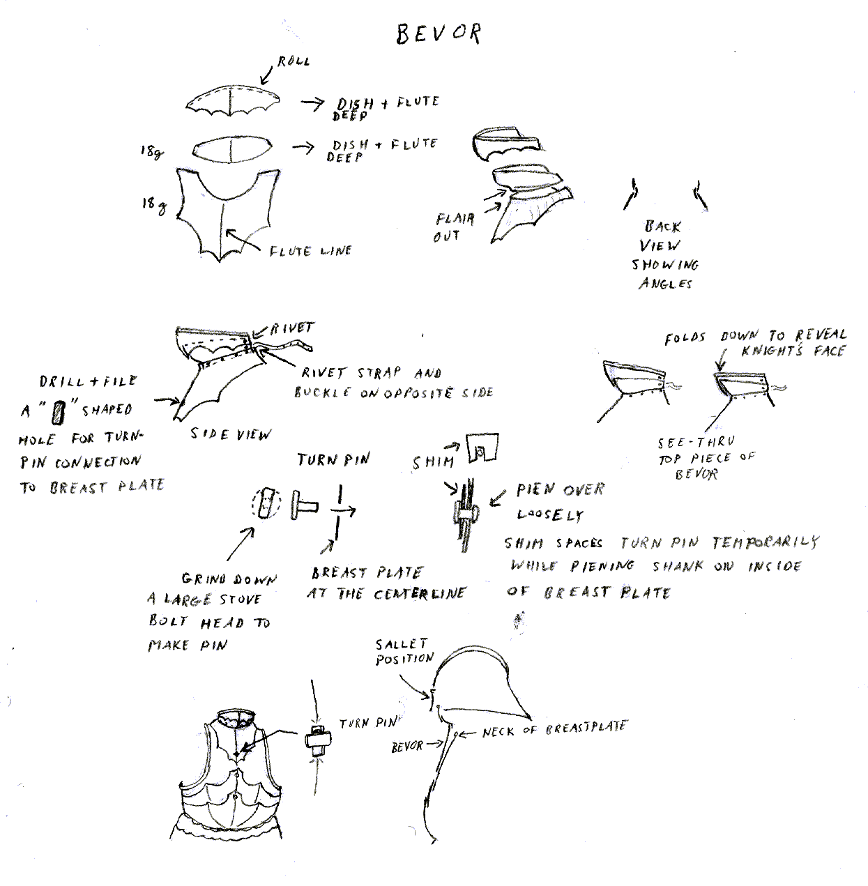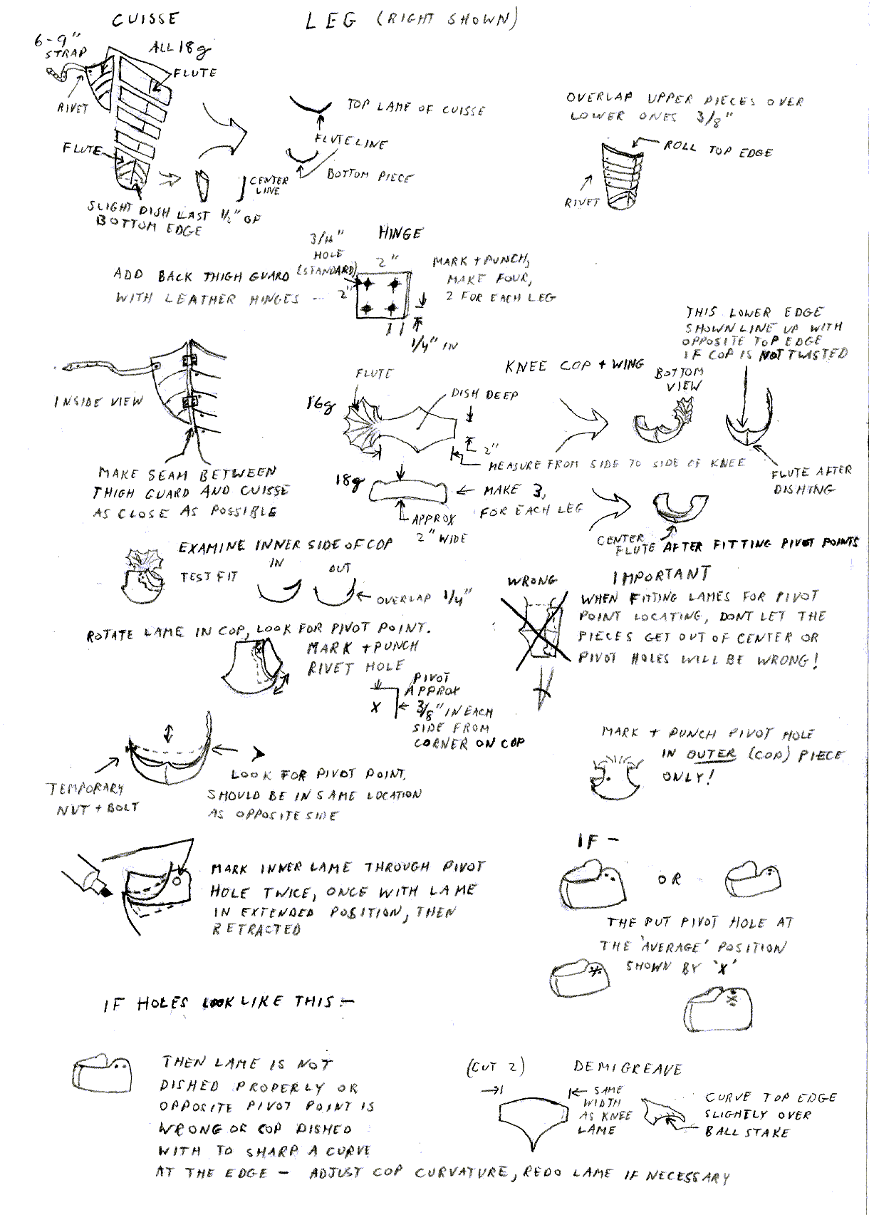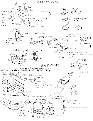 I recently found my old notes on how to make Gothic German Armour, written about ten years ago when I was a young apprentice in armouring. Click on the thumbnails above to view these notes and patterns. Keep in mind that the patterns are not to scale, although the proportions are correct. These patterns and instructions were derived from construction of the suit of German armour shown on the left side of the main page of this website. They can be used as a guide for new armourers just learning the proper shapes of the parts of a suit of plate armour. Some details, such as attaching the finger pieces of the gauntlets to a leather strap instead of directly to the glove, need correction. |