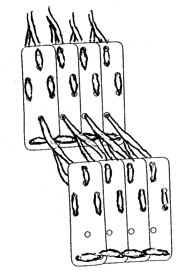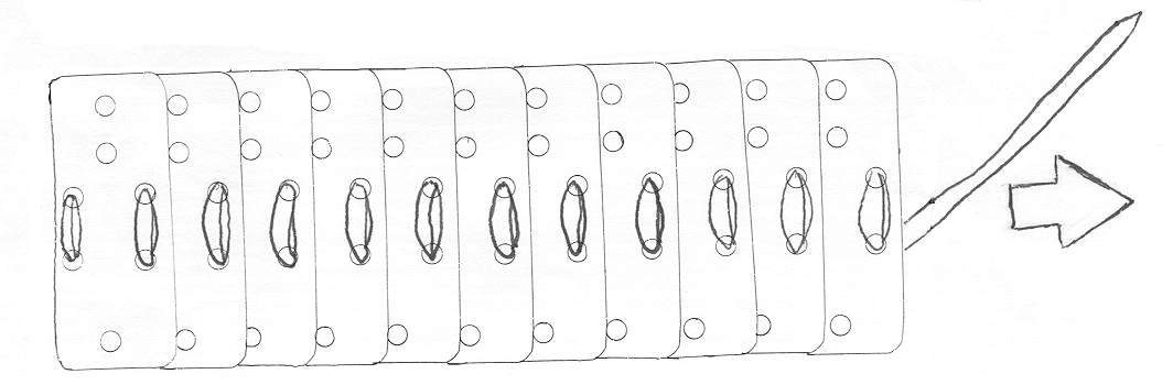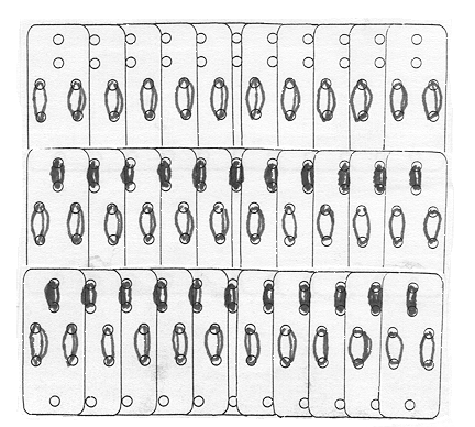 Basic Construction. My lamellar utilizes T-6 (6061 alloy) or T-3 aluminum (3003 alloy) for lightness, durability and strength. Each lamellae is punched with 9/32 inch holes to accommodate 6mm diameter BRAIDED Maxicord™. I find the larger hole and cord diameter gives added strength to the lace and retards frequent repair. Plate thicknesses vary from .040 to .063 inches which is equivalent in thickness and tensile strength to 18-14 gauge mild steel. For those who prefer period metals, I might suggest Dragonscale™ who uses 16- 18 gauge galvanized steel. The zinc plating closely resembles the “tinned” lamellar of the late Roman and Carolingian periods. Extant period lamellar harnesses overlap upwards, a function useful to horsemen contending with infantry. This is not a viable option for a man fighting on foot, as a downward stroke can snag an edge of a plate or catch on a lacing-cord. My suits are constructed with an overlap of plates aligned upward above the waist, but downward below the waist. I use three different lacing styles in my lamellar suites. Figure 1