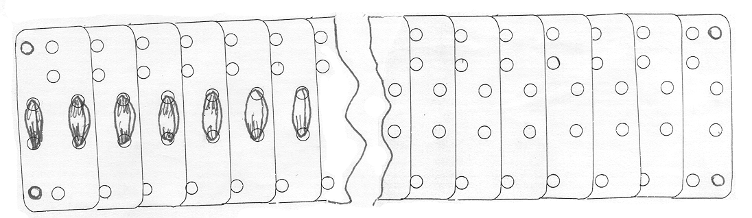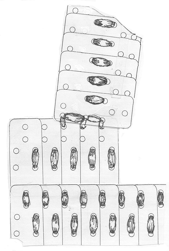 To attach skirts, you must first make WAIST PLATES. Take Measurement A, count out the number of "international" lamellae. You must now an eighth hole to each plate as shown (Figure 18) and lace as normal.